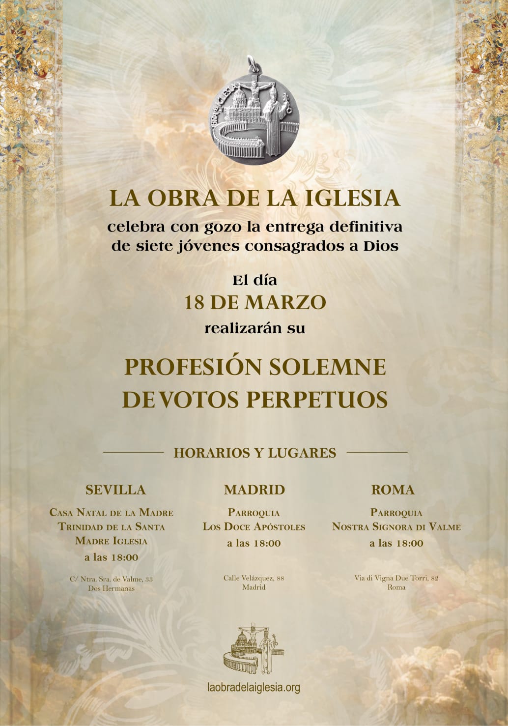 La Obra de la Iglesia celebra con gozo la entrega definitiva de siete jóvenes consagrados a Dios. La celebración será el día 18 de marzo con la profesión solemne de votos perpetuos.