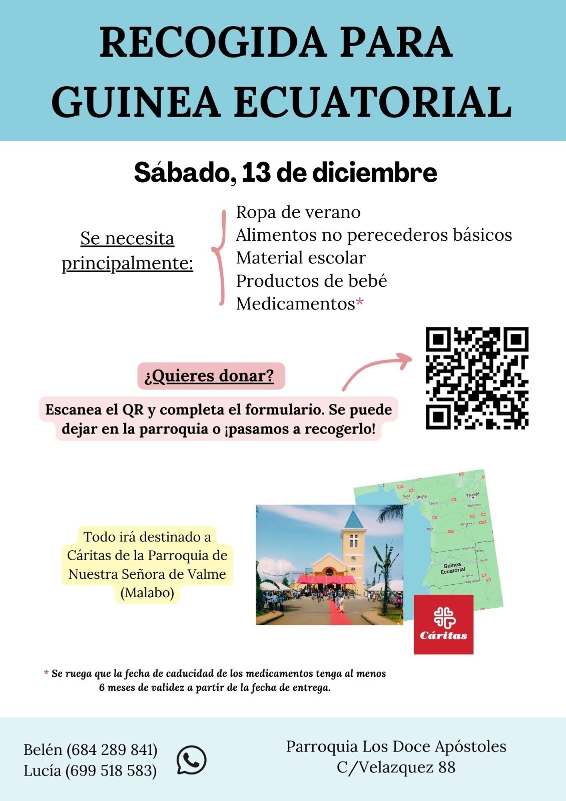 Campaña de recogida de ropa, material escolar, alimentos y medicamentos para Cáritas de la Parroquia Nuestra Señora de Valme situada en Malabo, Guinea Ecuatorial.